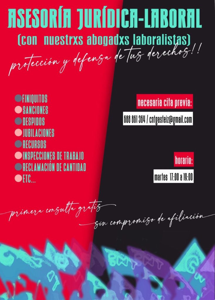 La acción sindical es nuestra base, y ahora sumamos una herramienta vital e imprescindible: asesoría jurídica propia en tu sindicato de Vitoria, en la CNT, en el número 65 de la Corre. Todos los martes entre las cinco y las siete de la tarde.